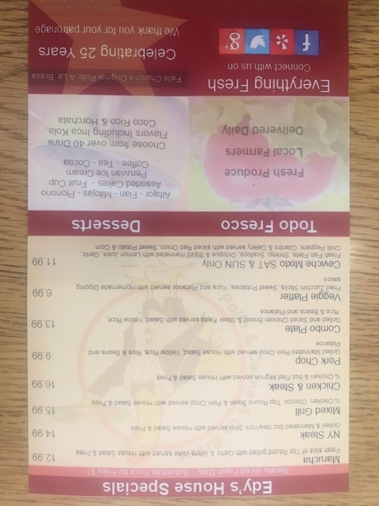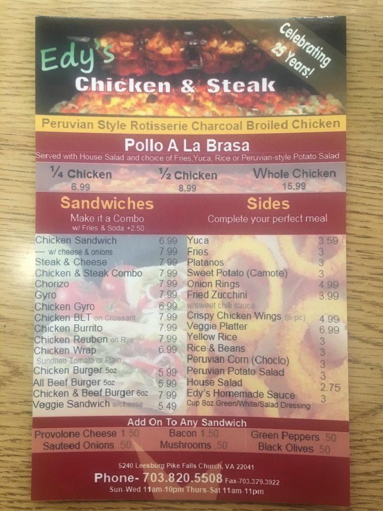 Edy's Chicken & Steak Restaurant in Falls Church, Virginia is a Peruvian gem offering Peruvian Style Rotisserie Charcoal Broiled Chicken, house specials like the Mix Grill and Chicken & Steak, and delightful desserts like Alfajor and Flan. The restaurant provides a range of services including takeout, reservations, delivery, catering, and accepts various payment methods. Customers rave about the delicious chicken, flavorful yellow sauce, and quick, friendly service. The vibrant atmosphere and tasty dishes make Edy's a must-visit for lovers of chicken and steak. While some mention a slight change in the white sauce consistency, the overall experience and quality of food earn Edy's a solid 4 out of 5 stars. Don't miss out on the mouthwatering meals and welcoming ambiance at Edy's Chicken & Steak Restaurant.
